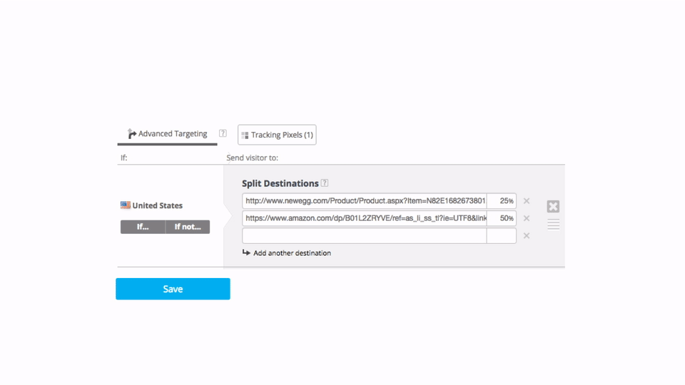 Automatically route a percentage of your clicks to different destinations for the same audience segment. Compare landing page and storefront performance.